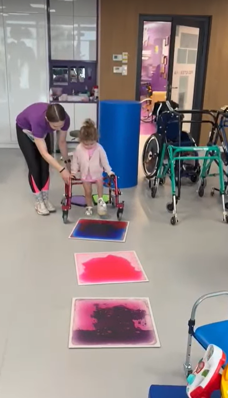 Può camminare con la scarpina rialzata per la prima volta e adora la sua fisioterapista che segue molto volentieri.